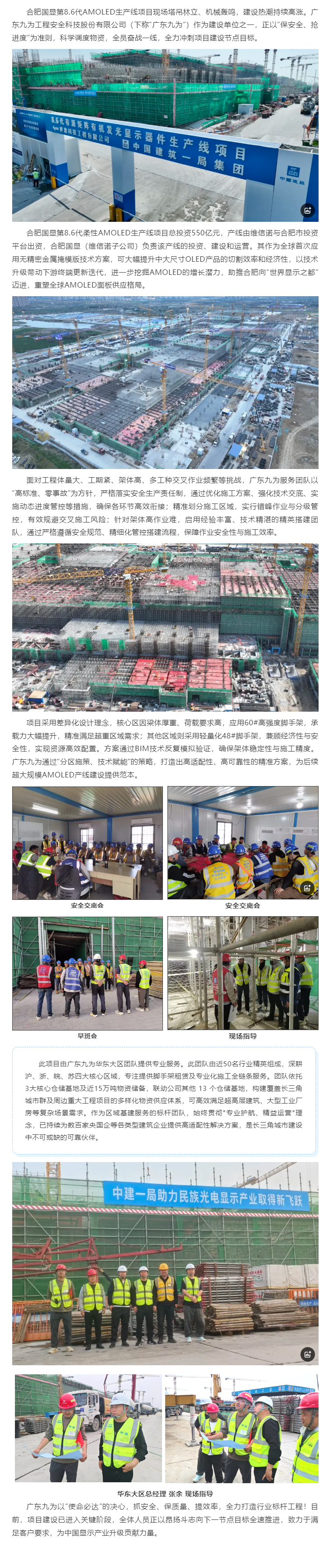 【概要描述】合肥國顯第8.6代AMOLED生產線項目現(xiàn)場塔吊林立、機械轟鳴,建設熱潮持續(xù)高漲。廣東九為工程安全科技股份有限公司(下稱“廣東九為”)作為建設單位之一,正以“保安全、搶進度”為準則,科學調度物資,全員奮戰(zhàn)一線,全力沖刺項目建設節(jié)點目標。